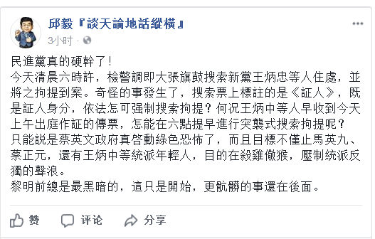最後,邱毅還寫道,“黎明前總是最黑暗的,這只是開始,更骯髒的事還在後面”。