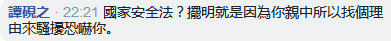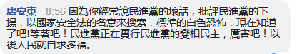 也有網友感嘆,“國家安全法?擺明就是因為你親中,所以找個理由來騷擾恐嚇你”。“因為你經常説民進黨的壞話,批評民進黨的下場,以‘國家安全法’的名意來搜索,標準的白色恐怖,現在知道了吧!等着吧!民進黨正在實行民進黨的‘變相民主’,厲害吧!以後人民就自求多福。”