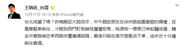 值得一提,王炳忠本月16日晚剛剛隨新黨訪問團從大陸返台,17日他還專門發了一條微博慨嘆,在趕赴朋友婚禮的路上,大老遠在西門町就見到層層拒馬,戒備森嚴,最後自己只能下車徒步十分鐘前往會場。