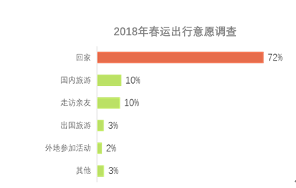 回家過年是每一箇中國人的盼望,一年一度的春運牽動這中國億萬家庭的心。《報告》的調查數據顯示,回家過年仍是春運不變的主題,有72%的受訪者表示回家是其春運出行的主要目的。另外,隨着人們生活水平的提高和“有錢沒錢、回家過年”觀念的改變,有13%的受訪者選擇外出旅遊,在別的城市感受不一樣的年味。