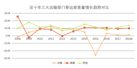 近十多年來,全國春運旅客發送量整體呈現逐年上升的趨勢,其中鐵路發送旅客量保持着連年持續增長。2018年春運,鐵路預計發送旅客量3.93億人次,同比去年增長10%,遠高於公路交通1.1%。隨着人們消費觀念的轉變和民航運力的提升,春運期間選擇民航的消費者越來越多,2018年春運民航預計發送旅客6700萬人次,比去年同期增長14%,在三大運輸部門中增幅最大。