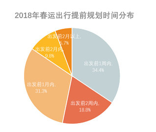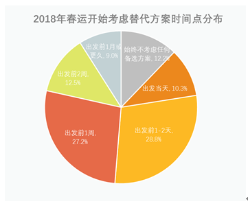 《報告》顯示,回家仍然是2018年春運不變的主題,平均出行距離約700公里。近7成旅客表示會提前一週開始規劃行程,有近半旅客需經歷至少一次大交通中轉,51.9%的旅客願意犧牲旅途時間換取順利出行。在明確無法通過首選方案出行時,有48.7%的旅客會提前一週考慮替代交通出行方案,並對替代交通出行方案的智慧化推薦服務需求巨大,超過7成旅客表示樂於嘗試採納推薦方案。