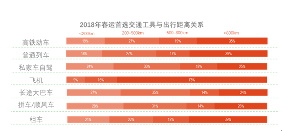 《報告》顯示,出行距離在200公里以內和800公里以上的比例最高,分別為33.5%和30.1%,2018年春運的平均出行距離約為700公里,相當於北京到鄭州的距離。在交通工具的選擇上,出行距離在200公里以下的選擇公路出行的最多,但隨着出行距離的增加,逐步向火車和飛機等交通工具轉變,整體而言,火車仍然是春運期間中遠程出行的首選交通工具。