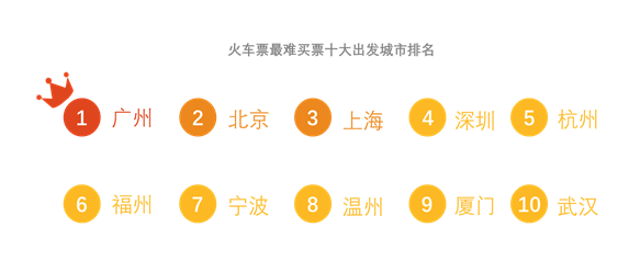 雖然2018年春節相對較晚,但因為務工流和探親流的疊加效應,今年春運依然呈現出顯著的“東熱西冷”分佈態勢。儘管我國鐵路路網規模快速增長,但面對春運客流高峯,熱點線路依然是一票難求,其中“廣州、北京、上海、深圳、杭州、福州、寧波、温州、廈門、武漢”為火車票最難買票的十大出發城市。