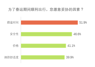 在一項“為了春運期間順利出行,您最願意妥協的因素”用户調查中,數據顯示,有過半的受訪者表示願意犧牲在路途中的時間換取春運期間的順利出行,佔比高達51.9%。此外,有41.1%和39.9%的受訪者願意在價格和出行舒適度上進行妥協。這充分説明,人們不管多久、多折騰,乃至犧牲舒適度,都要回家和家人過個團圓年。