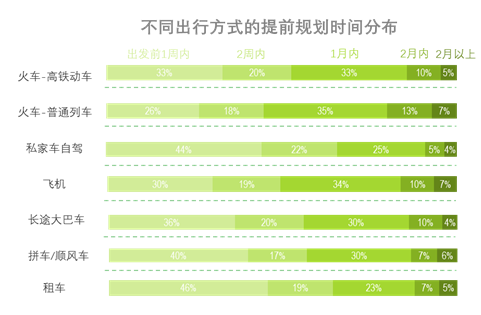 面對春運的“回家難”,促使人們春運出行愈加理性,提前規劃出行的意識較強。《報告》顯示,近7成受訪者表示會提前一週開始規劃行程,以火車作為交通工具的受訪者中有約34%選擇提前一個月規劃出行時間,而選擇自駕、租車等形式回家的旅客在提前規劃時間上則顯得更為靈活。