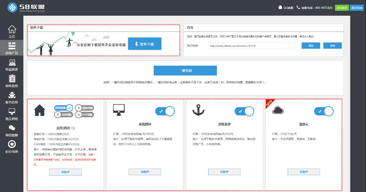 “58聯盟”的軟件下載頁面其實是一個“病毒生成器”,任何人只要在“58聯盟“註冊,即可下載生成的後門病毒,在後門病毒植入用户電腦開始運行後,開始從“58聯盟”持續獲得分成。另外,這些下游推廣渠道不僅可以自由領取任務,甚至可以通過排除IP的方式向某些地區定向傳播病毒。