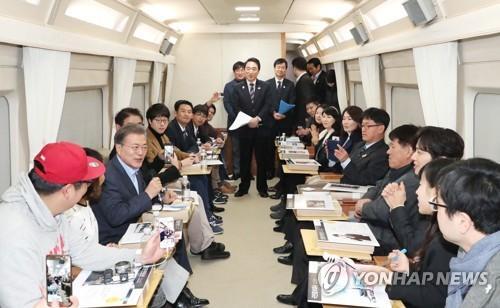 報道稱,文在寅在列車上與體育記者團舉行了懇談會,呼籲他們為成功舉辦冬奧會提供合作。約過1小時40分鐘後,文在寅在江陵站下車,同平昌奧運會志願者見面。