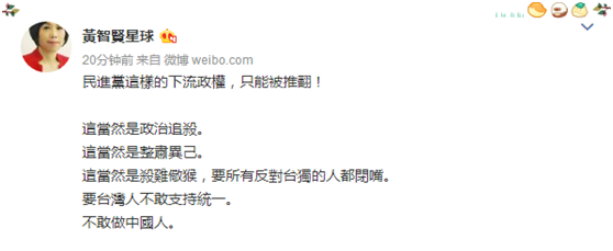 這樣的事,讓愛打抱不平的黃智賢憤怒了,她説:“這當然是政治追殺,這當然是整肅異己,這當然是殺雞儆猴,要所有反對台獨的人都閉嘴,要台灣人不敢支持統一,不敢做中國人。昨天清晨6點開始,新黨王炳忠,侯漢廷和林明正,陳思俊都被檢調搜索,然後直接拘提帶走。我們當然都知道朝廷鷹犬們正在努力醜表功,各大小單位都在努力證明自己,打擊‘今上’(指蔡英文)異己的能力和進度。”