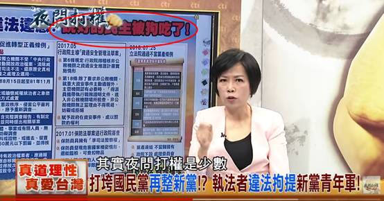 節目嘉賓賴士葆表示:“民進黨執政之後,不斷地把行政權擴大,擴大到吃掉司法權,我們很訝異的是,那些律師統統跑去哪裏?法官跑去哪裏?以前國民黨執政都大聲講,現在都安靜。現在民進黨只剩一個,叫皇權!因為皇帝,蔡英文是皇帝。行政權不斷擴大,司法權沒有了。”