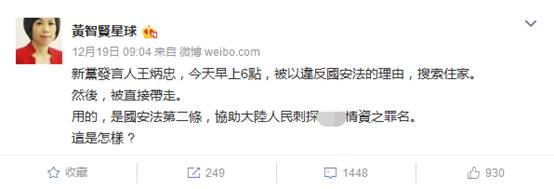 這樣的事情,自然不會被黃智賢忽略。在節目播出前,她就在自己的微博上貼文,稱“新黨發言人王炳忠,今天早上6點,被以違反國安法的理由,搜索住家。然後,被直接帶走。”用的是“國安法”第二條,協助大陸人民刺探‘台灣’情資之罪名。