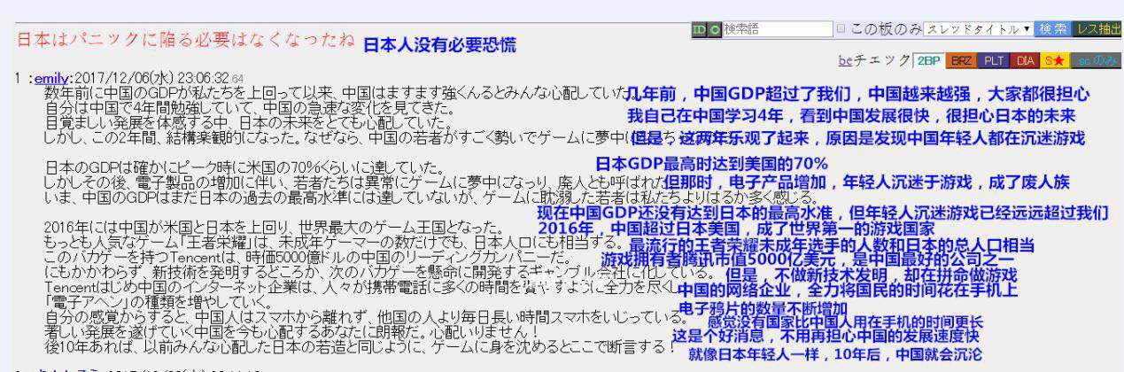這名自稱在中國留學4年的日本網民稱,近年來在日本國內瀰漫着一種恐慌情緒,擔心日本被中國遠遠地超越。尤其是2010年中國GDP超過日本後,這種情緒尤濃。在這篇帖子裏,這位日本網民勸説自己的同胞不用為此恐慌,因為他在中國看到了一種現象——遊戲陷阱。