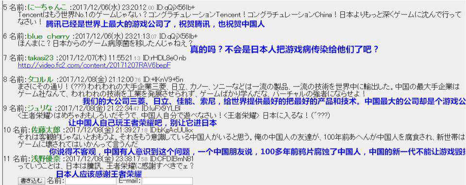 在“2CH”論壇上,這個帖子吸引了不少日本人的討論,言語中頗有些幸災樂禍的意味。有日本網民表示“不會是日本人把遊戲病傳染給中國了吧”,“我們的大公司三菱、日立、佳能、索尼……中國最大的公司卻是個遊戲公司。”。還有日本網民揶揄要“感謝騰訊”,“感謝王者榮耀”,“別讓它進日本”。