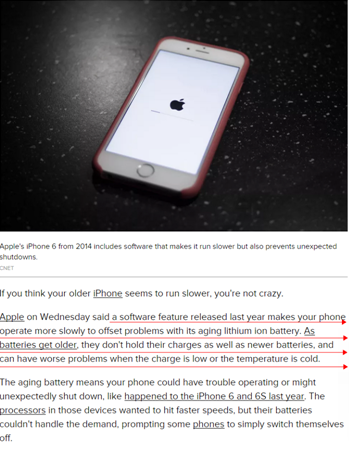 CNET報道稱,蘋果公司在聲明中表示,隨着手機電池的老化,它們的供電能力大不如前,如果供電量不能滿足手機處理器所需電量或者天氣很冷,蘋果手機會自動關機,這會對手機產生嚴重影響。去年iPhone 6和iPhone 6S等機型經常自動關機。因此,蘋果公司去年發佈的iOS 10.2.1系統對電池的供電模式進行了調整,通過減緩手機的反應速度來防止手機突然關機。iOS 10.2.1系統適用於iPhone 6、6 Plus、6S、6S Plus和SE機型。iOS 11.2系統將這一模式擴展到了iPhone 7和7 Plus等機型。