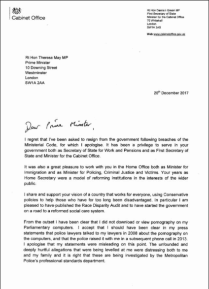 (英國首相副手、內閣大臣兼內閣辦公廳大臣達米安·格林的辭職信)