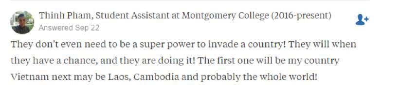 他上來就説:“中國不需要等到成為超級大國就可以入侵別國!他們只要有機會就會這麼做,現在也正在這麼做!首當其衝被侵略的就會是我們越南,接下來是老撾、柬埔寨,還可能是整個世界!”