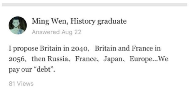 “2040年會是英國,然後法國,再然後是俄羅斯、日本和歐洲一些國家,因為我們有‘債’要還。”