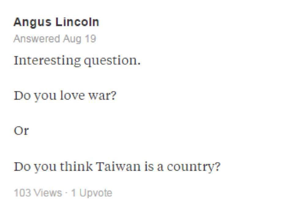 “這問題真有意思。你喜歡打仗麼?還是你把台灣看做一個國家?”
