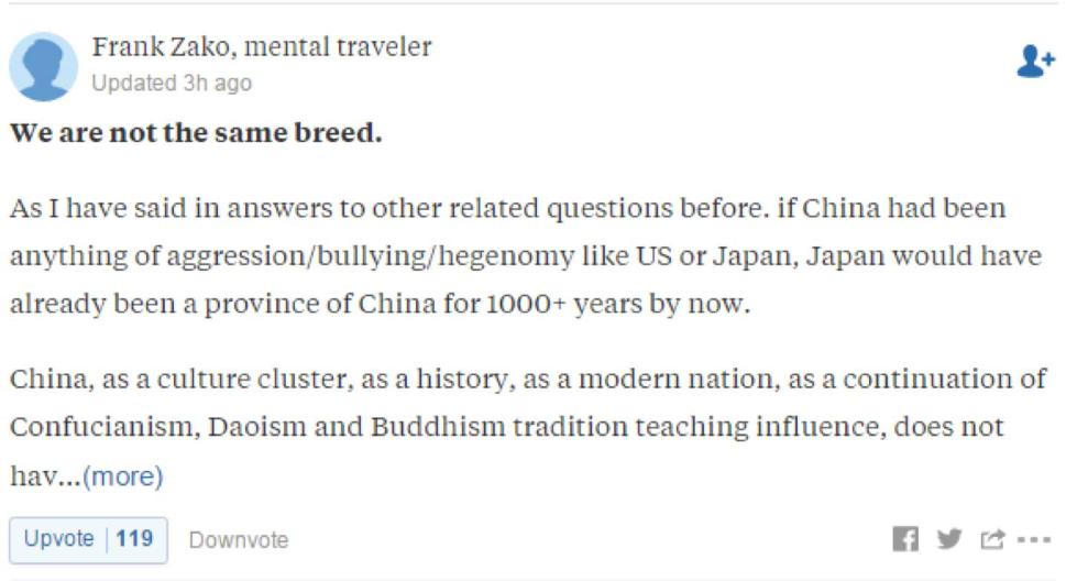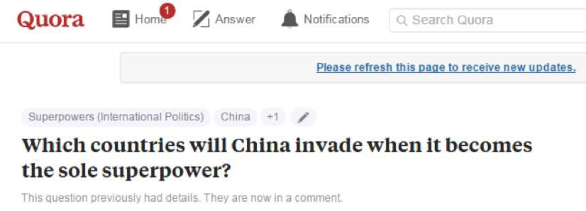 美國問答類社交類網站Quora上一直不乏關於中國的各種提問。但“當中國成為唯一超級大國,會侵略哪個國家?”的出現還是有點“扎眼”。