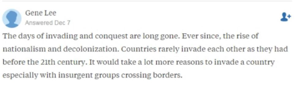 Gene Lee説,入侵和征服別國的時代早就結束了,之後興起的是民族主義和去殖民化。21世紀後,國家間很少會彼此侵犯。需要太多理由才能讓一個國家去侵佔別國了。20世紀後半期的侵略行為更多是為了進行政治操縱。而現在想要實現這個目的,有很多其他的手段。