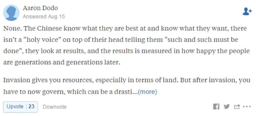 “一個國家都不會侵略。中國人知道自己擅長什麼、想要什麼。”網友@Aaron Dodo認為,“中國人注重結果,結果的好壞是用人們以及子孫的生活幸福程度來衡量的。”眾多歷史經驗教會中國,過度擴張會導致滅亡。中國人願意舒服自信地治理自己現在的國家,沒什麼興趣不斷擴張。“這並不代表中國不與周邊國家結交。即便在古代,中國也擅長同周邊國家簽訂契約進行合作。”通過貿易交流便利化,中國與其他國家實現共同獲益。如今的中國處在工業化改革中,他們關注自身轉型,更不會考慮侵略擴張。