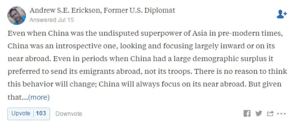 “害怕當今中國的人們都誤會了,”在美國網友@Andrew S.E. Erickson看來,“中國已證明自己是一個保守大國,行為和美國、俄羅斯有很大差別”。即使中國在前近代時期就是一個沒有爭議的亞洲超級大國,它也善於自省,主要關注國內或鄰國的事情。在人口過剩時期,中國更願意向外輸出移民,而不是軍隊。沒有理由會認為中國的行為會發生變化。