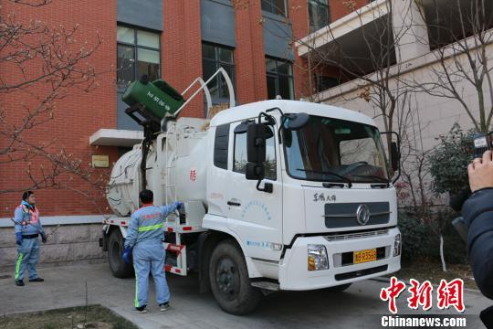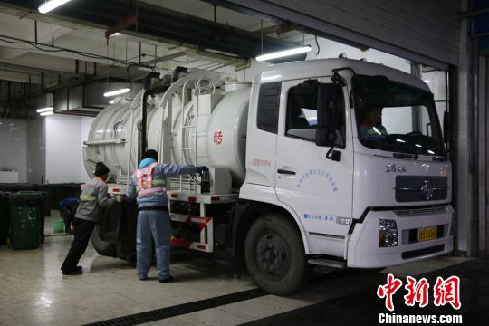 圖為垃圾運輸車在青島李滄萬達廣場進行垃圾分類收集。該廣場日均產生餐廚垃圾約40桶左右,配備專人進行垃圾二次分類,並由專門收運車隊負責垃圾分類運輸。 李英 攝