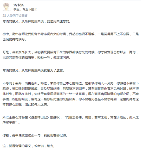 很多人都不明白,為什麼語文課本上好些文章都要求要“背誦全文”?一名網友的回答着實戳心(見下圖)。