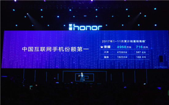在榮耀四週年慶現場,榮耀公佈了賽諾市場研究機構11月中國移動通訊市場數據報告,賽諾數據顯示榮耀在2017年1月到11月手機累計銷量達到4968萬台,銷售額突破716億元,穩居中國互聯網手機份額第一。而在2017年雙11期間,榮耀更是全面爆發,在天貓和京東平台的手機銷售額共計超40.2億元,成為中國互聯網手機第一品牌。