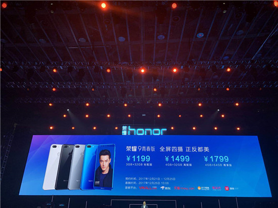 全新發布的榮耀9青春版包含3個版本,其中3GB+32GB標配版1199元,4GB+32GB高配版1499元,4GB+64GB尊享版1799元。2017年12月21日-12月25日在華為商城、京東、天貓榮耀官方旗艦店、蘇寧易購、唯品會、國美開啓預約,12月26日10:08於以上平台正式發售,青春AI拍,歡聚榮耀”12月26日,榮耀9青春版同步在天貓歡聚日首發。