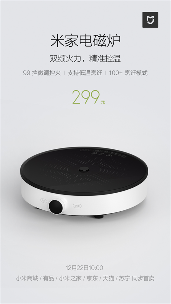 普通電磁爐往往採用傳統的按壓式面板進行操控,僅僅擁有部分常用烹飪功能,操作繁瑣複雜且容易出錯,遠遠不能滿足簡單易操作的使用需求;另外傳統電磁爐普遍採用方形設計,在日常使用時會存在易潑濺液體致按鍵面板失靈等問題。而此次米家電磁爐則採用了圓形設計,圓形外觀佔用面積更小,節省空間,更易於收納,另外搭配簡潔的小米設計風格,產品顏值極高。米家電磁爐還具有“低温烹飪技術”、“雙頻火力控制技術”、“自定義烹飪模式”等諸多智能功能,讓用户不僅能夠方便使用,更能輕鬆烹飪美食。這款米家電磁爐的售價僅為299元,對比售價千元的日系電磁爐也毫不遜色,可謂性價比十足。米家電磁爐將於12月22日上午10點在小米商城/小米之家/有品/天貓/京東/蘇寧同步開售,感興趣的用户不妨關注一下。