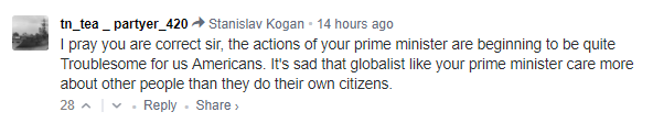 您總理的行為對我們美國人來説也是相當麻煩的。可悲的是,像他這樣的全球主義者更關心的是其他人,而不是他們自己的公民。