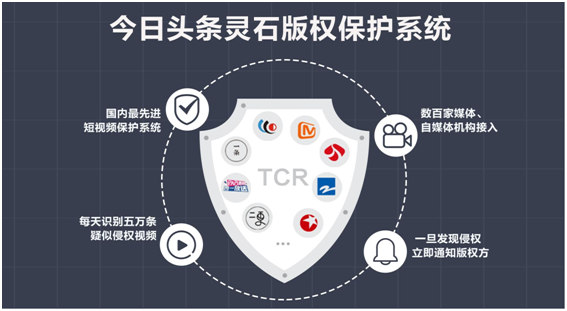 首先,今日頭條上線了國內首家短視頻版權保護系統靈石(Toutiao Content Recognition)。該系統由今日頭條工程師耗時數月研發,每天識別疑似侵權視頻5萬餘條,累計接入具有原創能力的製作機構超過400家,包括浙江衞視、江蘇衞視等400傢俱有原創能力的製作機構已經接入其中。