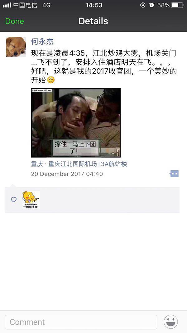 “收官”之旅並不順利。何永傑和他的團遭遇大霧,航班延誤。“好吧,這就是我的2017收官團,一個美妙的開始。” 何永傑在手機上打下這段文字,並在段末加了一個笑臉的表情。