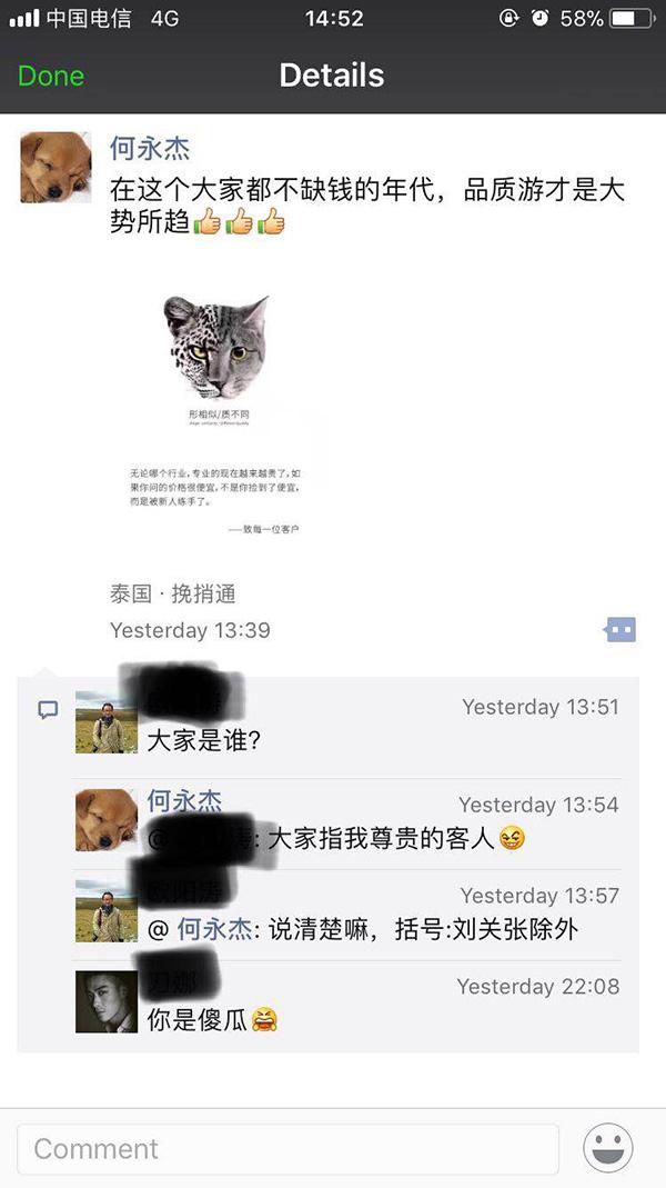 一天後,何永傑發了一條頗具“雞湯”的朋友圈。這條朋友圈的配圖文字説的是“無論哪個行業,專業的現在越來越貴了,如果你問的價格很便宜,不是你撿到了便宜,而是被新人練手了,——致每一位客户”。