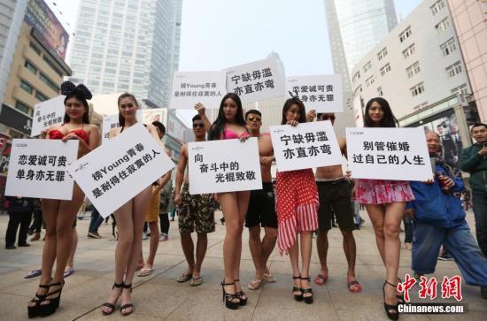資料圖:11月11日“光棍節”,南京某地產商請來着清涼夏裝的帥哥靚女搞起行為藝術秀,公開“挑戰脱單”。中新社發 泱波 攝