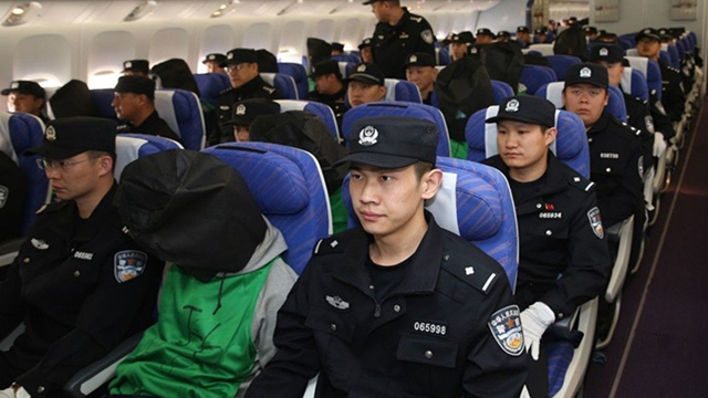 2016年4月13日,團伙成員統一帶頭套,坐飛機押送回國。