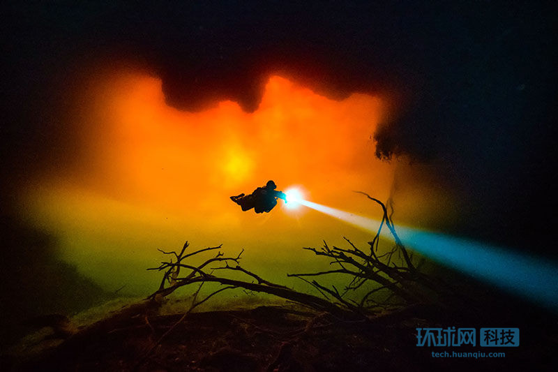 大雨和雨林徑流灌注墨西哥Cenotes瑪雅地下河洞,衝來的雜物形成了這個水底下的洞穴。從水下看到令人不安的淡黃色光暈。