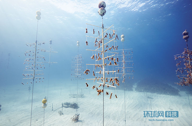 海水變暖和海洋酸化讓野外珊瑚的生存受到威脅,在佛羅里達州Tavernier 海岸,研究者試圖通過人工種植來恢復珊瑚生態。在佛羅里達州的這個苗圃裏生長着400多個“珊瑚樹”。