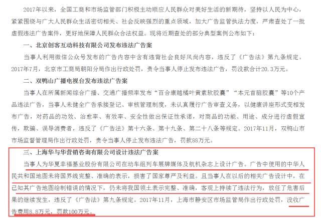 據國家工商總局網站所公佈的消息,在違法名單中,上海華與華營銷諮詢有限公司為華夏幸福基業股份有限公司在動車組列車展牌媒體及航機雜誌上設計廣告。廣告中使用的中華人民共和國地圖未將國界線完整、準確的表示,損害了國家尊嚴及利益。 且當事人在以後的相關廣告設計中,在已知其廣告地圖繪製錯誤的情況下,仍未將我國領土表示完整、準確,客觀上持續了違法行為,放任了危害後果的繼續發生,違反了《廣告法》第九條規定。2017年11月,上海市靜安區市場監管局作出行政處罰,沒收廣告費用8.8萬元,罰款100萬元。