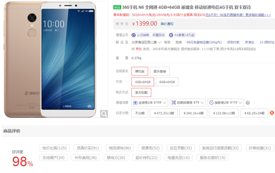 據悉,除了360手機N6外,目前市面上正在銷售的價位在1500元左右的機型還包括魅藍Note 6和紅米5Plus,兩款機型4+64GB高配版的售價分別為1499元、1299元,配置上,這兩款機型均採用了高通625處理器和LPDDR3運存標準,4000mAh電池;屏幕方面,魅藍Note 6採用了常規5.5英寸1080P屏設計;拍照方面,紅米5Plus使用了前置500萬+後置1200萬像素設計,從整體而言,這兩款機型的表現要明顯弱於360手機N6,而這一差別,使得360手機N6的性價比更為突出。