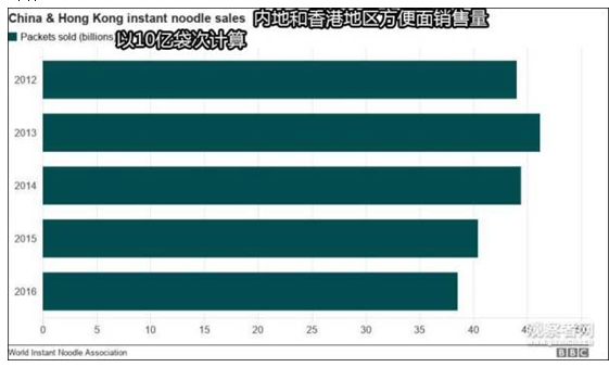 儘管在全球背景下,中國仍然是世界上最大的方便麪市場,但3年裏近17%的跌幅。被BBC記者阿特金森認為,城市中農村務工人口的減少,很可能是方便麪銷量下滑的重要原因之一。