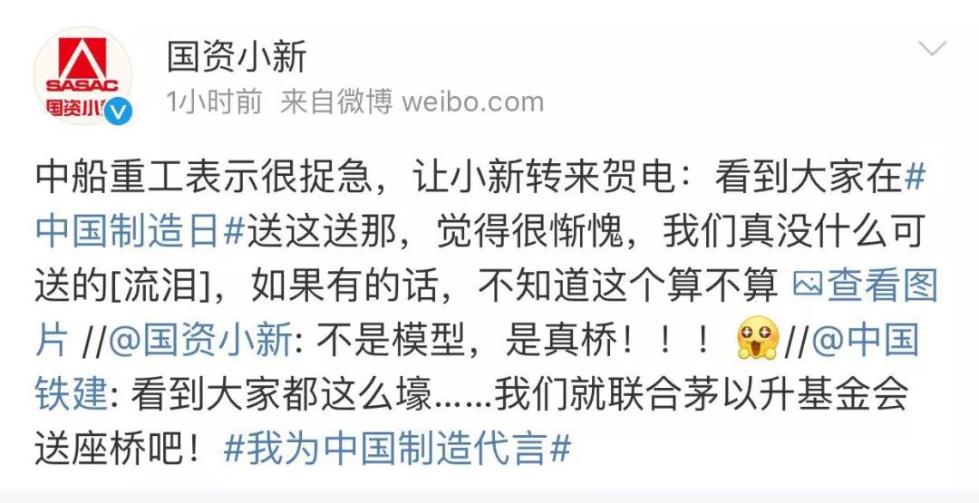 @中船重工 也不能落後,它讓小新幫忙發送賀電,並送了它