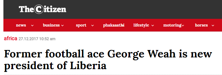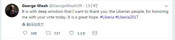 喬治-維阿在自己的推特上寫道:“我懷着深厚的感情想要感謝大家,感謝利比里亞人民,今天讓我榮幸地獲得了你們的選票。這是巨大的希望。”