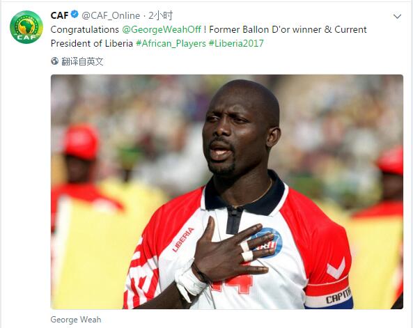 非洲足協官方賬號第一時間發推文為維阿送上祝賀:“祝賀喬治-維阿!前金球先生,現任利比里亞總統!”