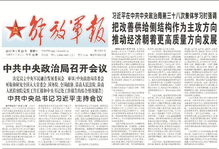 1月22日,中共中央政治局召開會議,決定設立中央軍民融合發展委員會,由習近平任主任。中央軍民融合發展委員會是中央層面軍民融合發展重大問題的決策和議事協調機構,統一領導軍民融合深度發展,向中央政治局、中央政治局常務委員會負責。