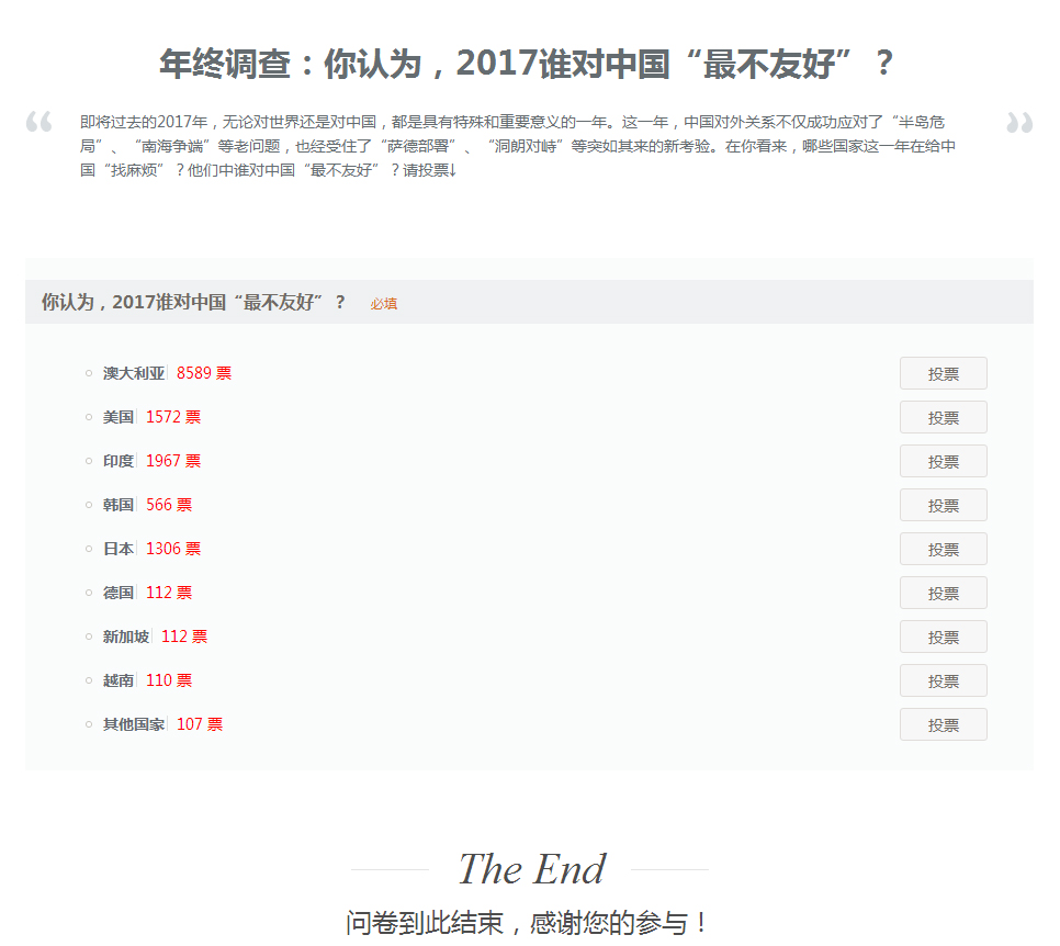 【環球網報道 記者 郭鵬飛】即將過去的2017年,無論對世界還是對中國,都是具有特殊和重要意義的一年。這一年,中國對外關係不僅成功應對了“半島危局”、“南海爭端”等老問題,也經受住了“薩德部署”、“洞朗對峙”等突如其來的新考驗。回望這一年的各種“風波”,你認為哪個國家對中國“最不友好”?環球網25日以此為主題,發起一項問卷調查。從這項調查結果來看:中國網民懂得感恩,但也“挺記仇的”。
