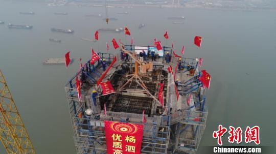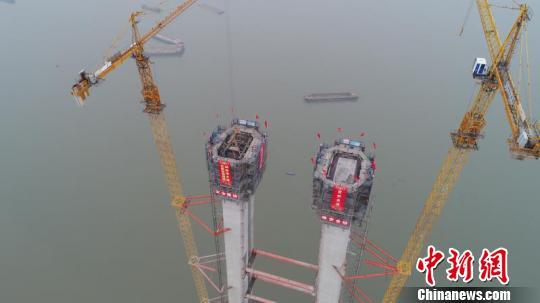 中新網武漢12月27日電 (劉佩婭 胡明傑 陳永創 徐金波)12月27日11時28分,經過近20個小時的連續奮戰,世界最大跨度雙層懸索橋——武漢楊泗港長江大橋南岸主塔成功封頂。至此,繼11月21日北岸主塔封頂後,大橋南北兩個主塔已全部封頂,下一步將轉入上部結構施工。