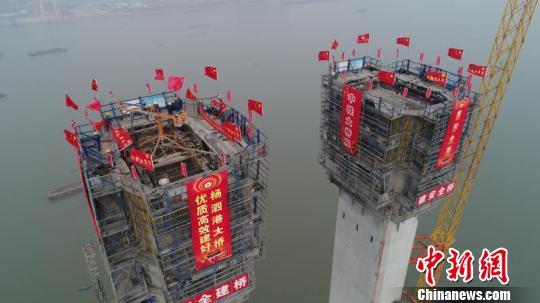 楊泗港大橋南岸主塔為鋼筋混凝土塔,設上、中兩道橫樑,塔柱高241.2米,相當於80多層樓的高度。主塔基礎採用沉井施工方案,塔柱施工分為40個節段進行,塔柱施工採用液壓自動爬模技術,塔身採用C60高強度混凝土。在主塔施工過程中,中鐵大橋局建設者面對世界級建橋難題,成功攻克解決了主塔超大沉井超厚超強硬塑黏土層下沉技術難題,僅用168天,就將3200餘平方米(相當於8個標準籃球場大)、重達12.3萬噸,如同“巨無霸”的主塔沉井成功浮運、下沉到位,使之如“定海神針”,穩穩立在大江深處。