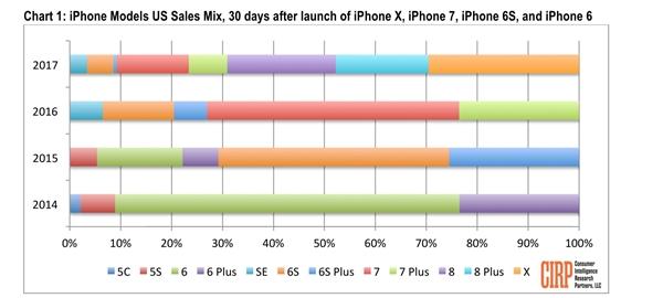 專業市調機構消費者情報研究公司(CIRP)日前公佈了一份自研報告,指出iPhone X開賣第一個月的銷量一般,不及iPhone 8雙機合併銷量。
